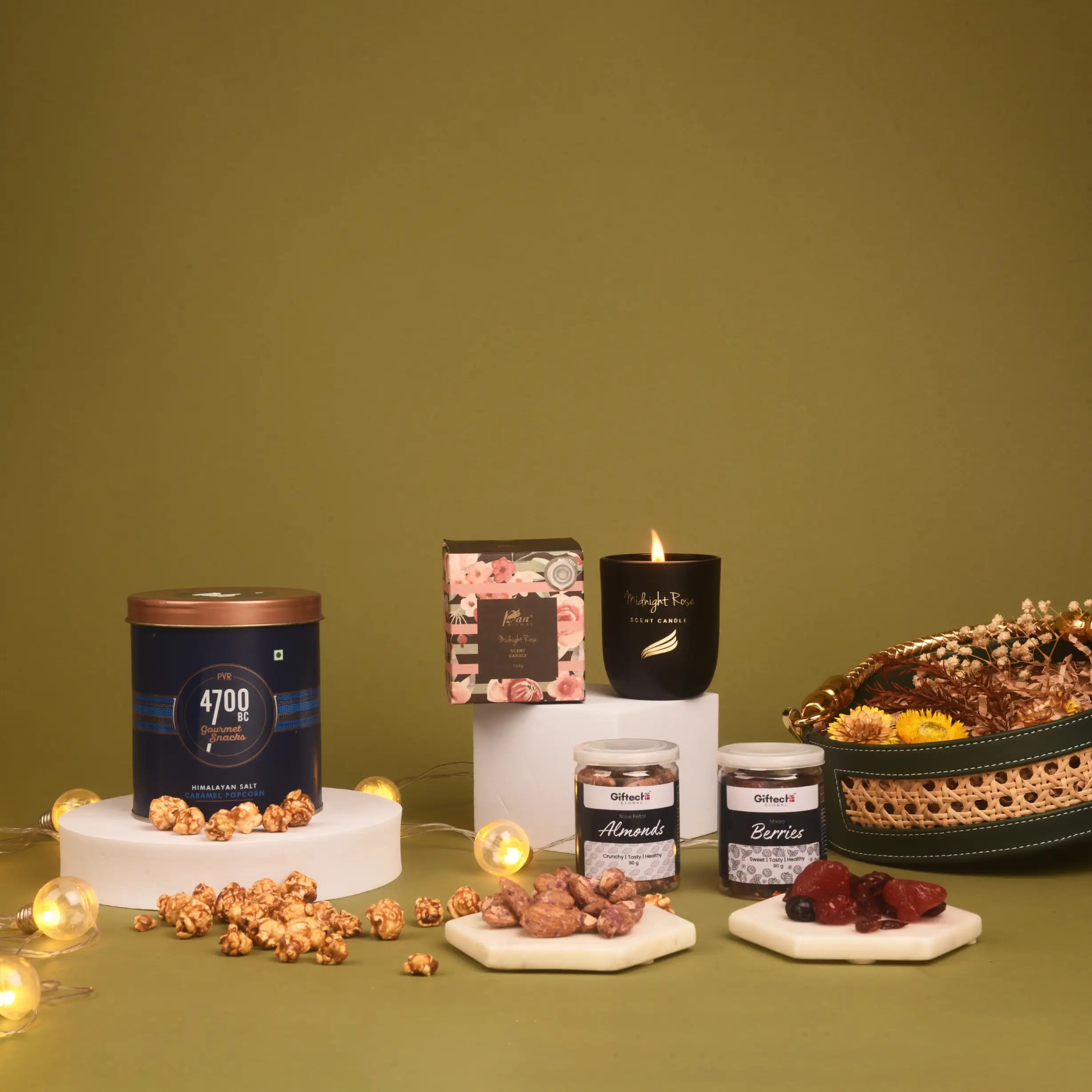 The Aromatic Escape Basket is a treat for the senses, a gourmet hamper that blends flavors, fragrances, and festive cheer into one elegant gift. Nestled in a charming green basket with a handle, it carries a mix of indulgent sweets, flavored nuts, and mood-setting accents that make every celebration brighter. The balance of taste and aroma makes it a unique choice among Diwali hampers, appealing to both food lovers and those who appreciate thoughtful presentation.