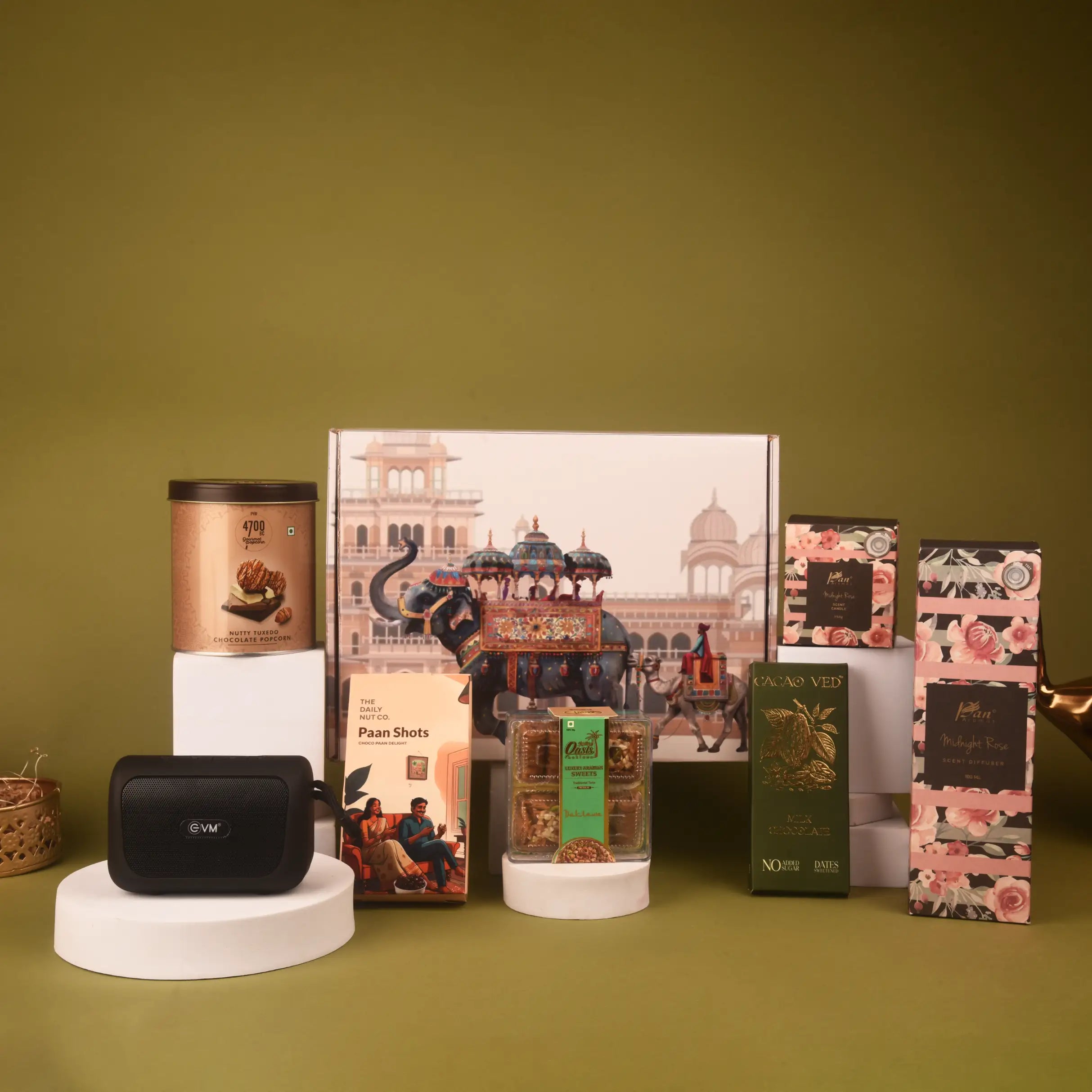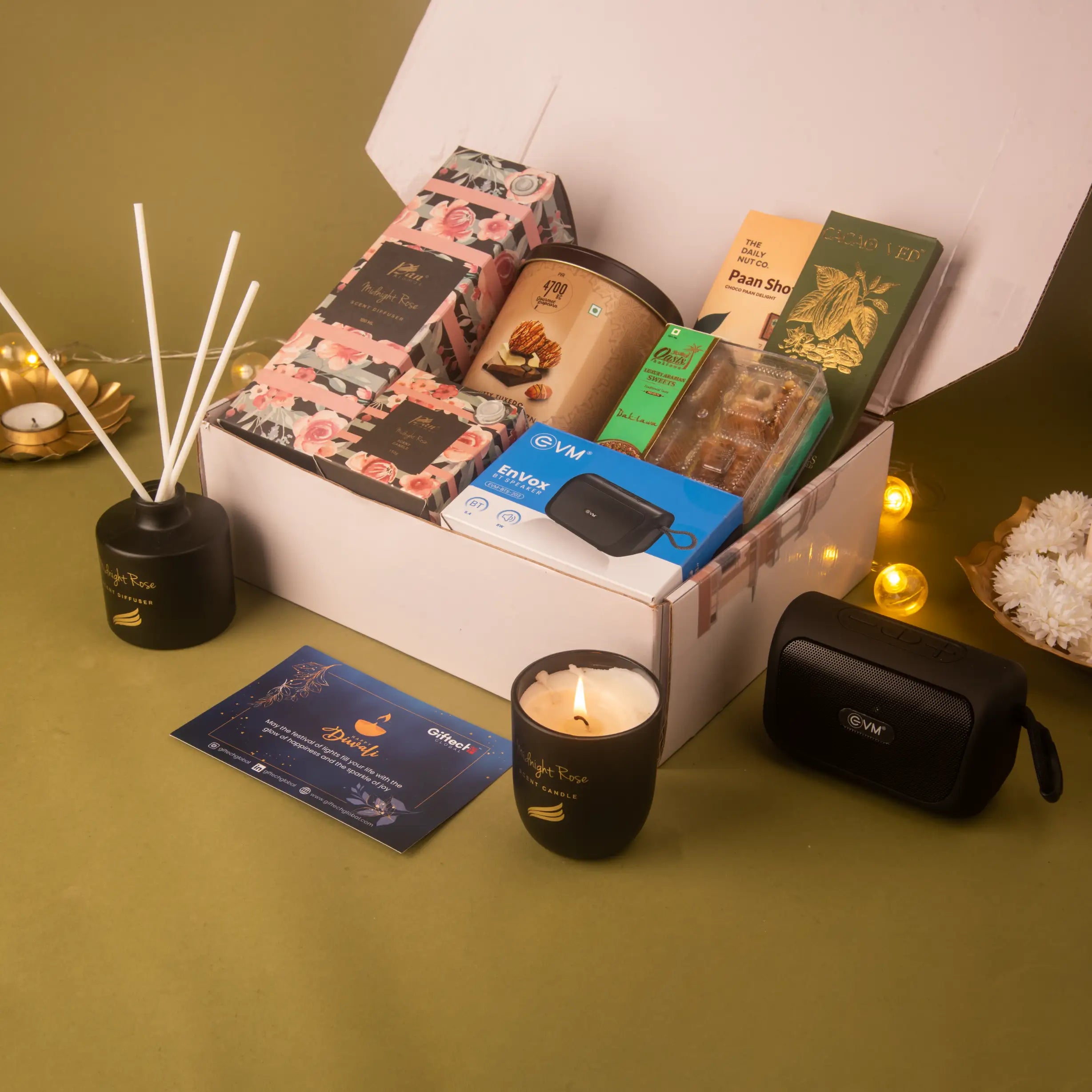 The Beats & Bytes Hamper is a unique blend of modern tech and festive indulgence, thoughtfully curated for celebrations that go beyond the ordinary. Pairing an Envox Bluetooth speaker with handpicked gourmet treats, this festive hamper is designed to delight both the senses and the spirit. Imagine enjoying premium baklava, paan shots, and artisanal milk chocolate while music plays in the background, creating the perfect festive mood. Enhanced with the calming fragrance of a rose diffuser and candle, this hamper creates an atmosphere of joy and serenity. Perfectly suited as one of the most versatile Diwali hampers, it balances indulgence with ambiance, making it ideal for personal gifting or corporate Diwali gifts that leave a lasting impression.