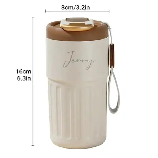 Revolutionize your coffee game with this chic Brown Insulated Flask. Once you start using it, there's no going back because its comfortable and simplistic shape and pastel colour make it stylish yet functional. The spill-proof lid securely holds your beverage, preventing spillage, and has a display that shows the temperature. Personalize the flask with your name.
