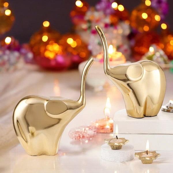 Uplift the ambience of your home with this majestic combo. The set includes lotus-shaped candles with metal holders and gold-coloured metal elephant figurines packaged in a kappa box. The elephants are made of premium-quality aluminium and have a flat base to keep them sturdy when placed on tables or shelves. Elephants symbolize good luck and can be placed in offices or living rooms. You can light the candles to infuse your home with a majestic atmosphere. These metal showpieces will surely attract the attention of your guests. You can also gift this to your clients, channel partners & employees with your brand logo printed on top of the box.