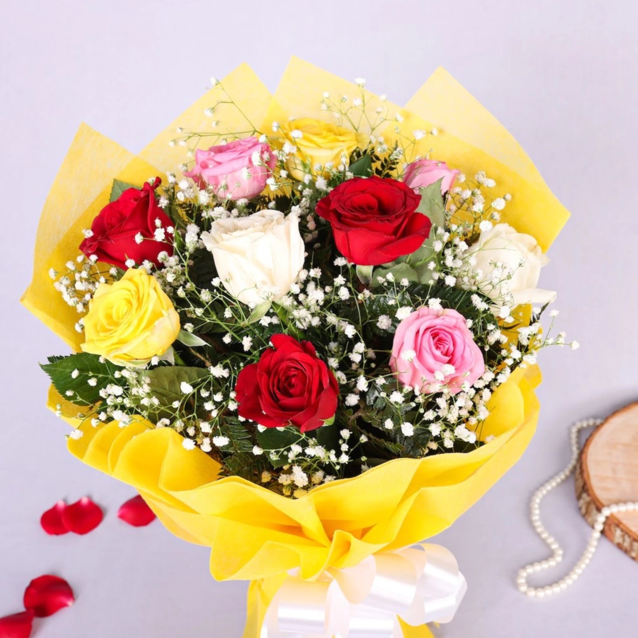 - Flowers Contains: 3 Red Roses , 3 Pink Roses , 2 White Roses , 2 Yellow Roses