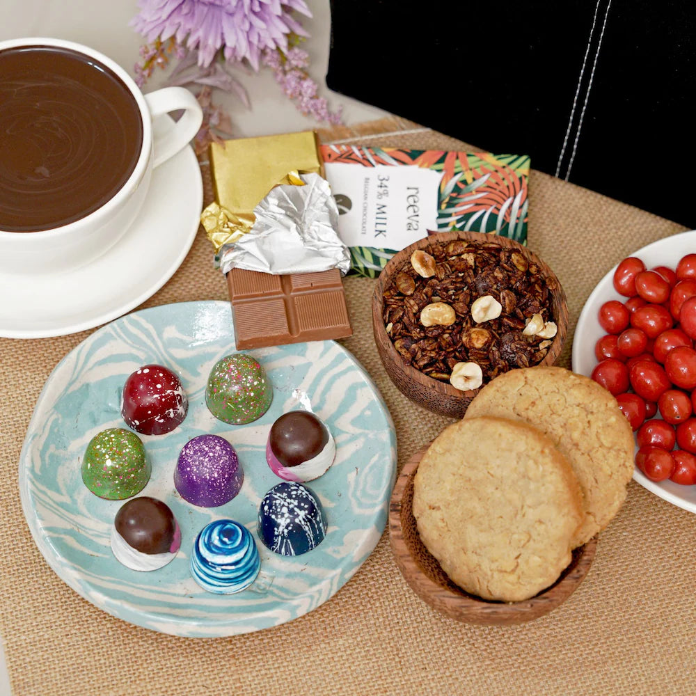 - 1 Box - (6 bon bon - Palet d'or, Passion Fruit Caramel, Salted Caramel Ganache, Hazelnut Feuilletine Crunch, Lemon Basil, Raspberry (Approx 12-13gm each)