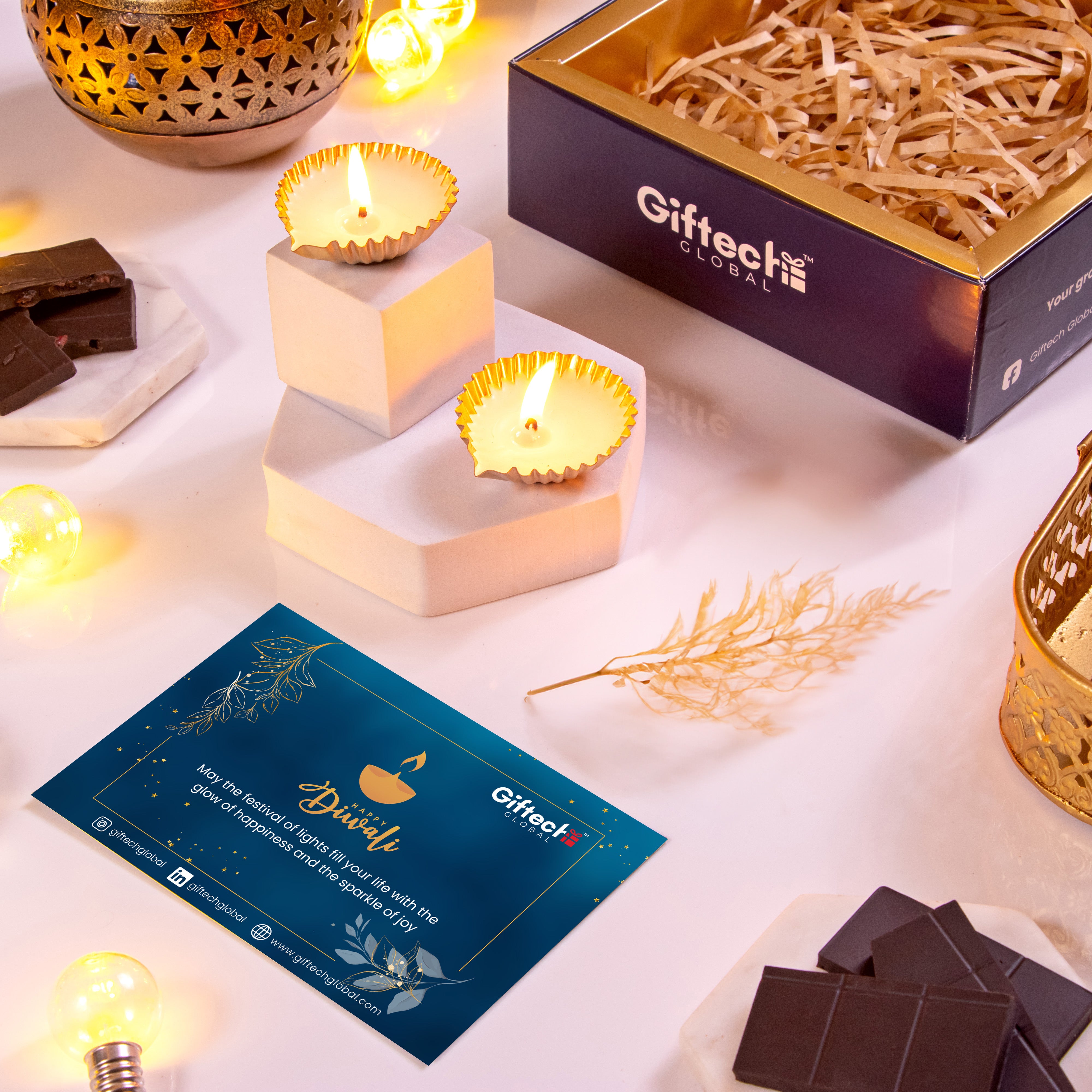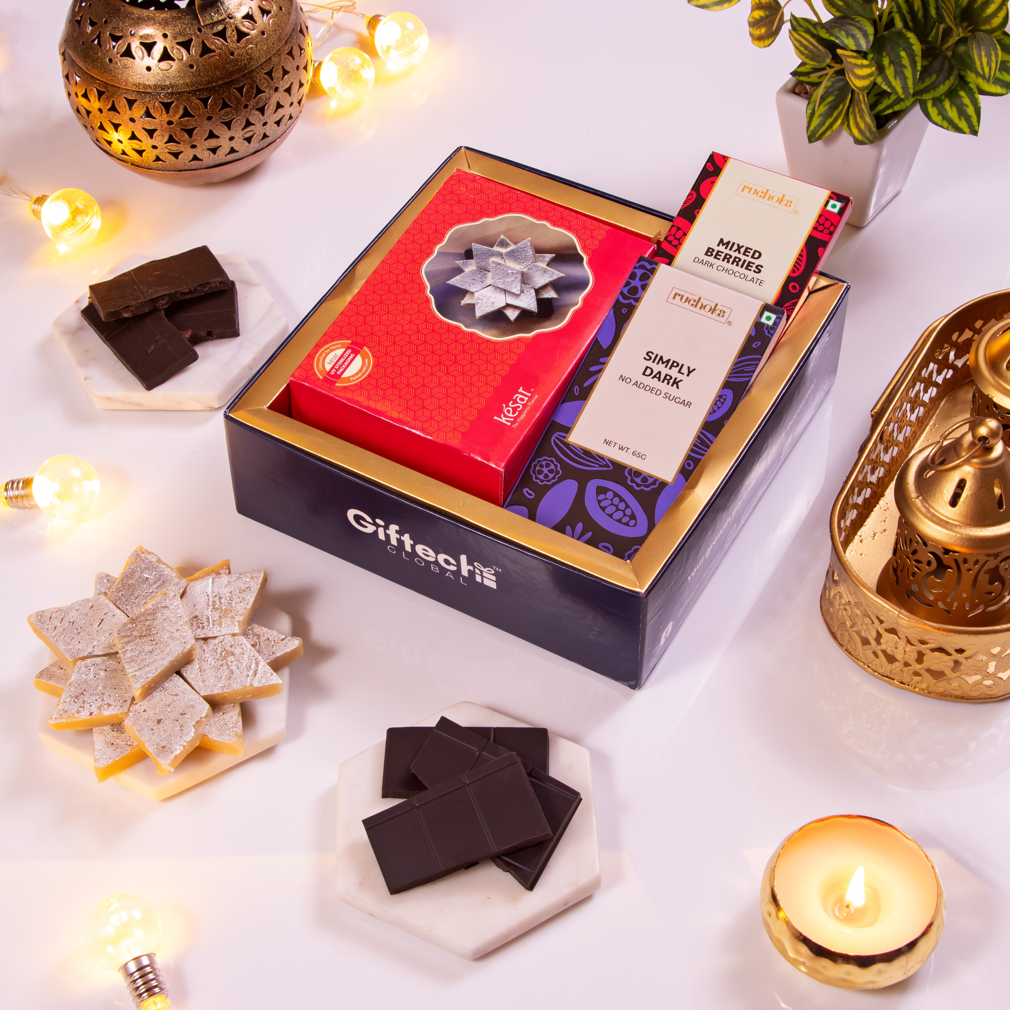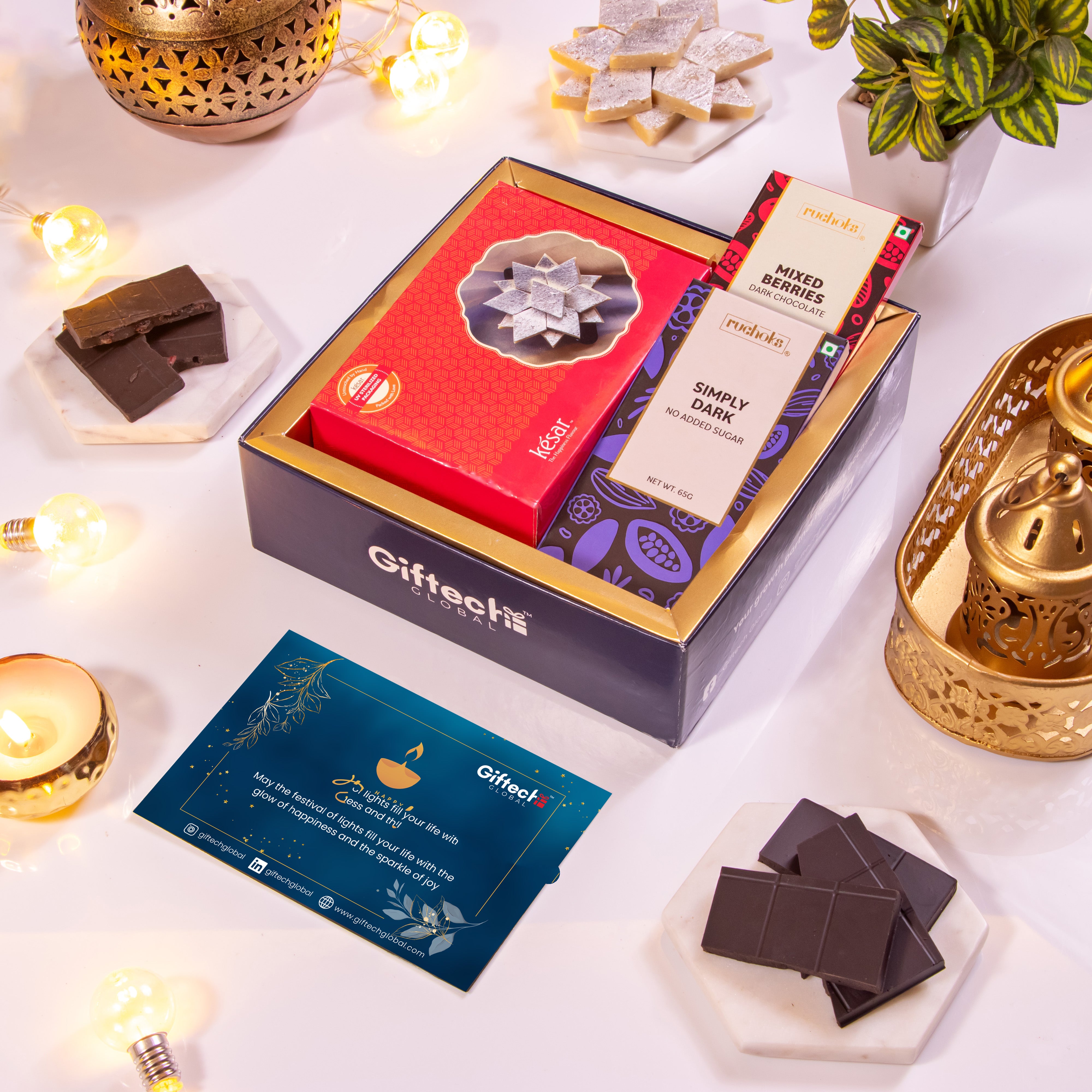 This festive season send a gift of art, flavours and celebrations to your patrons and clients with a hamper designed to reflect the Diwali spirit. The tray contains 2 metal candle votives, premium kaju katli and luxurious chocolates in 2 variants with a festive card.