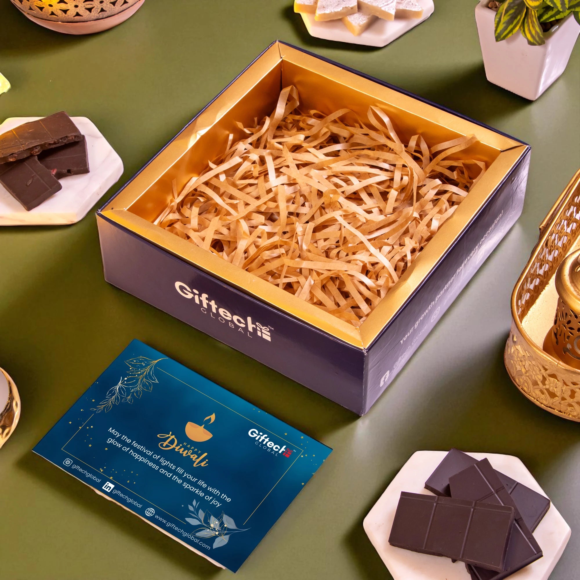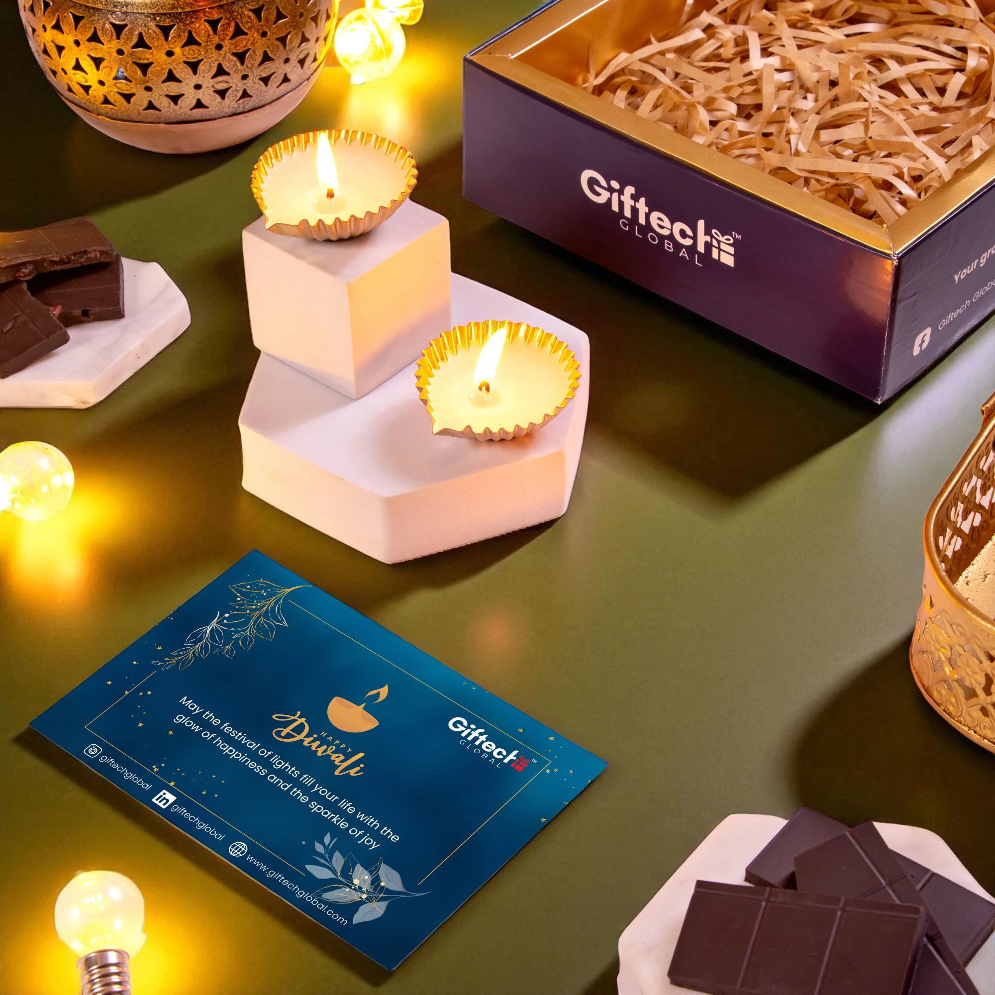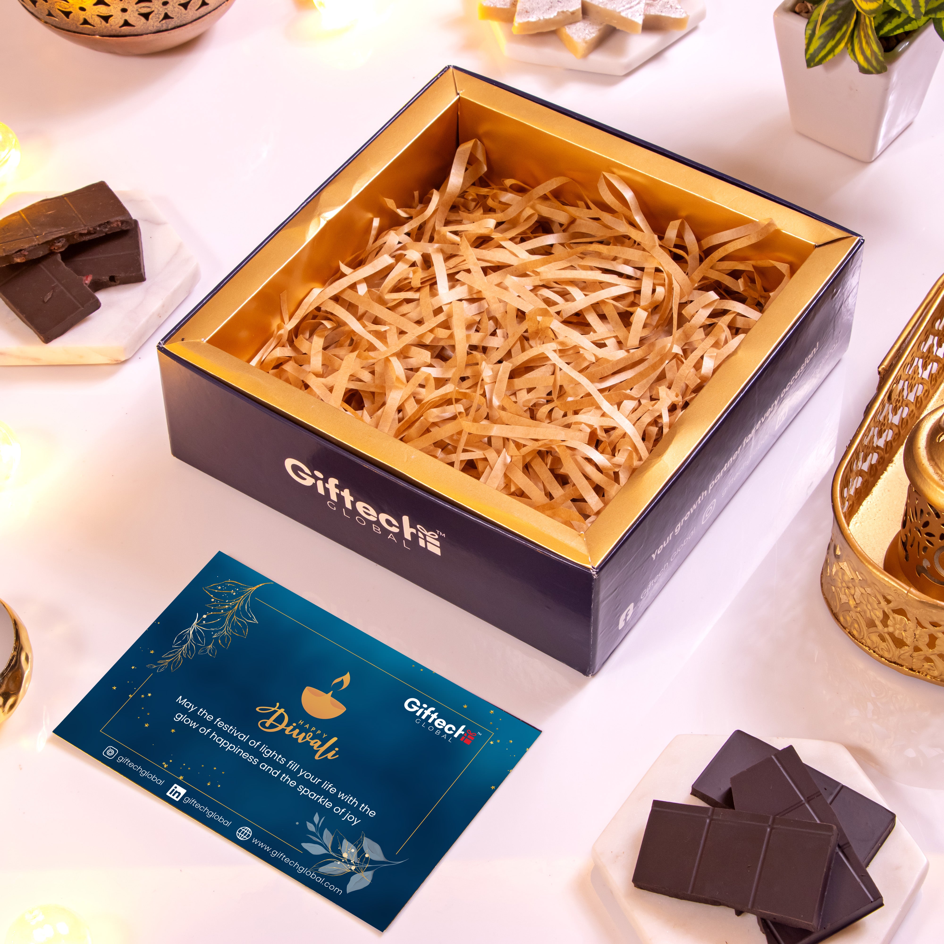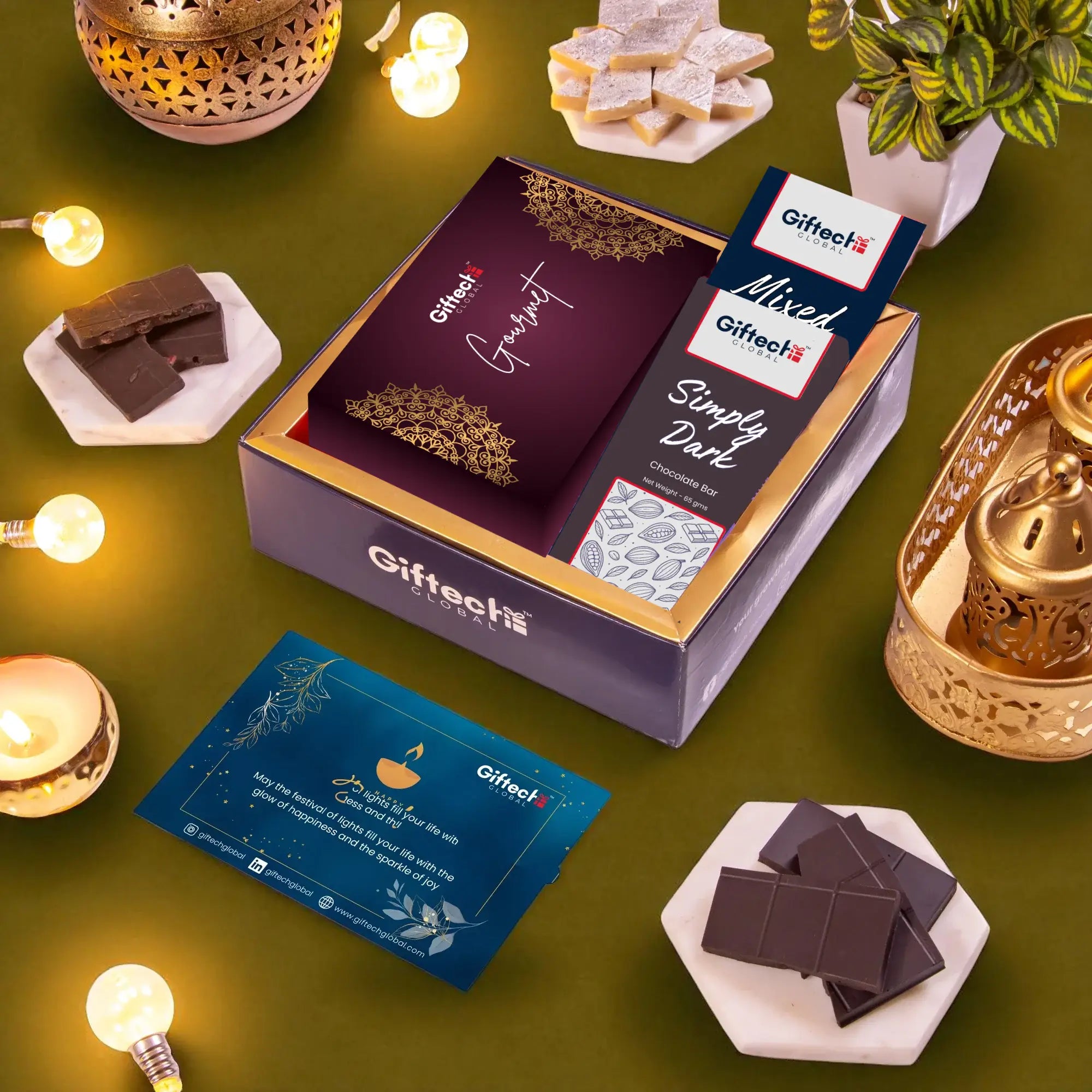 This festive season send a gift of art, flavours and celebrations to your patrons and clients with a hamper designed to reflect the Diwali spirit. The tray contains 2 metal candle votives, premium kaju katli and luxurious chocolates in 2 variants with a festive card.