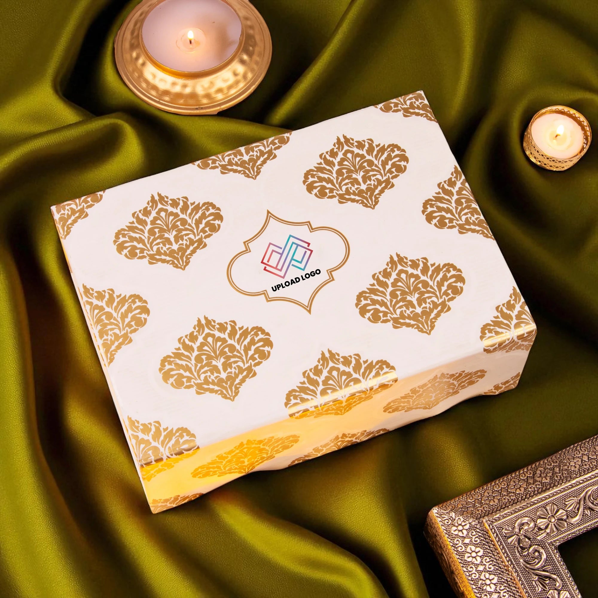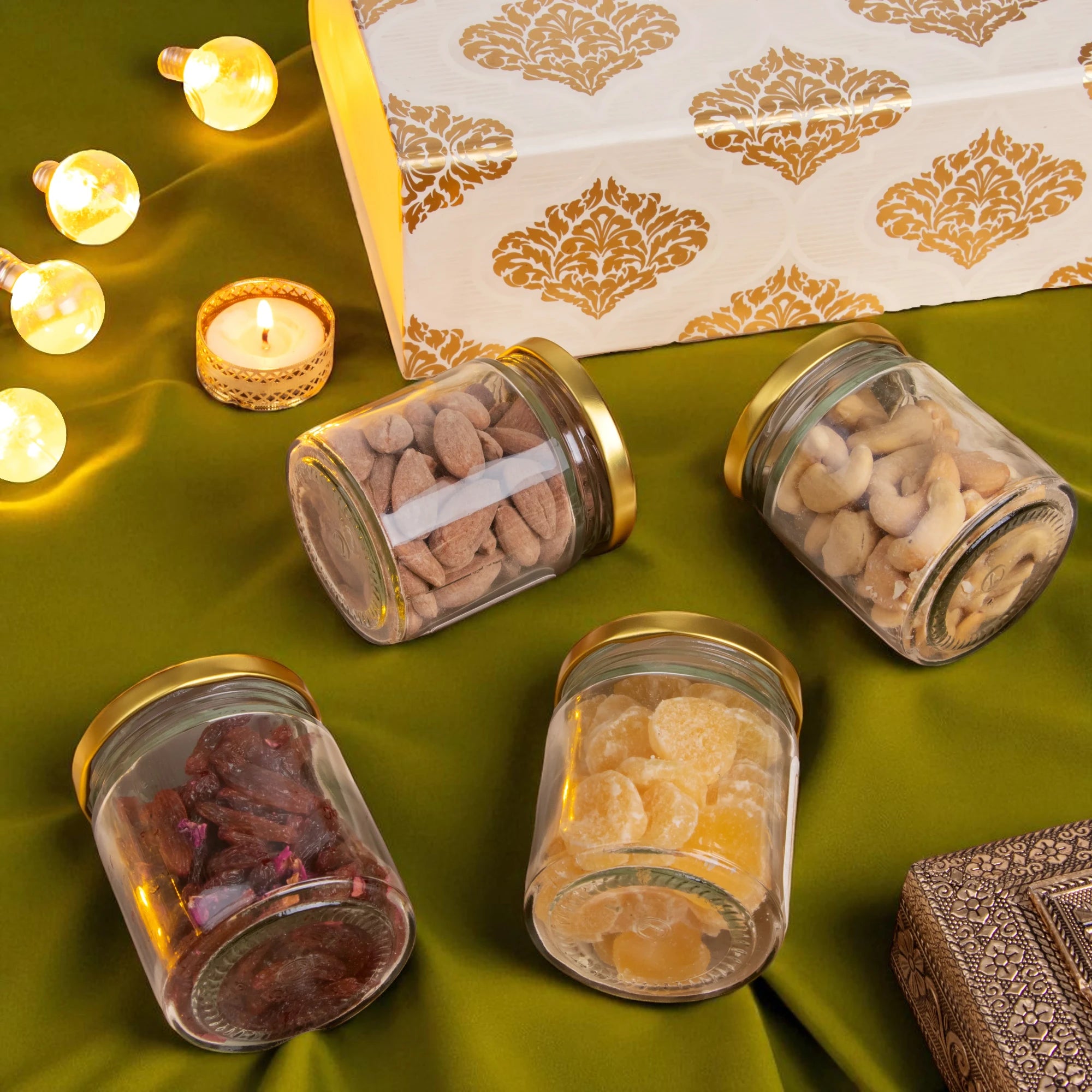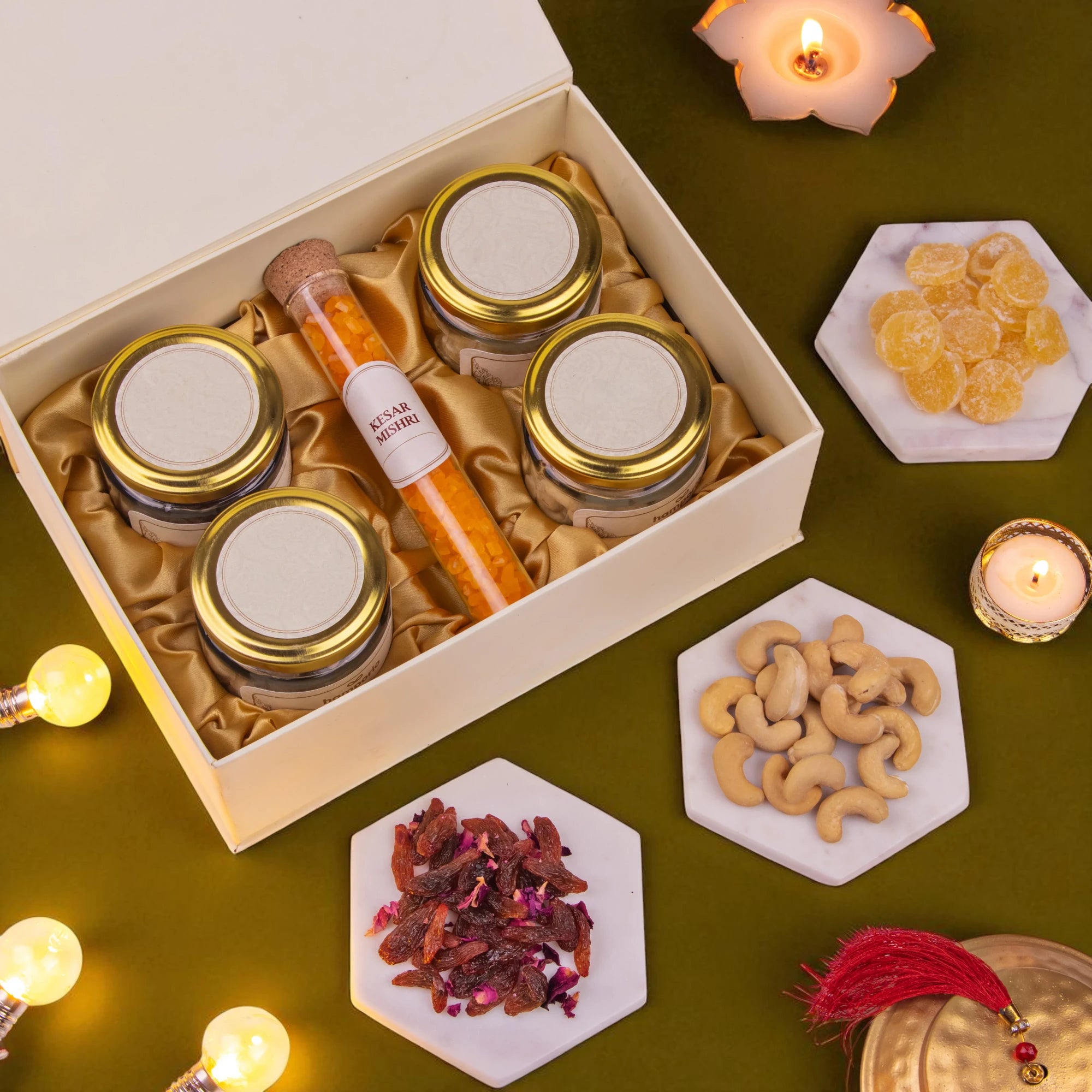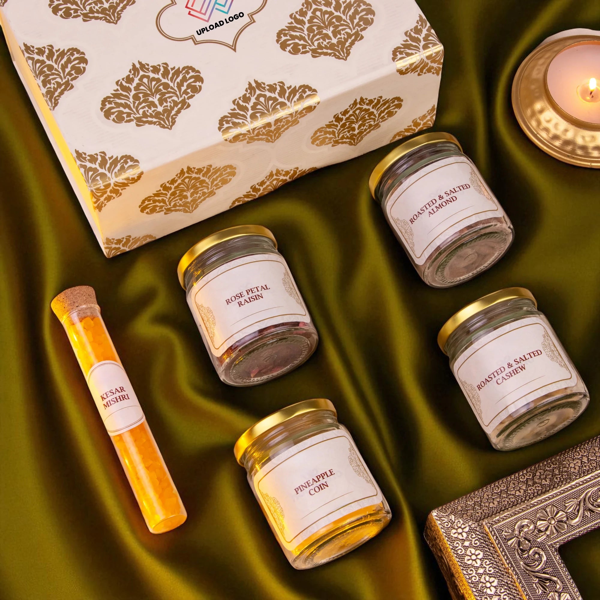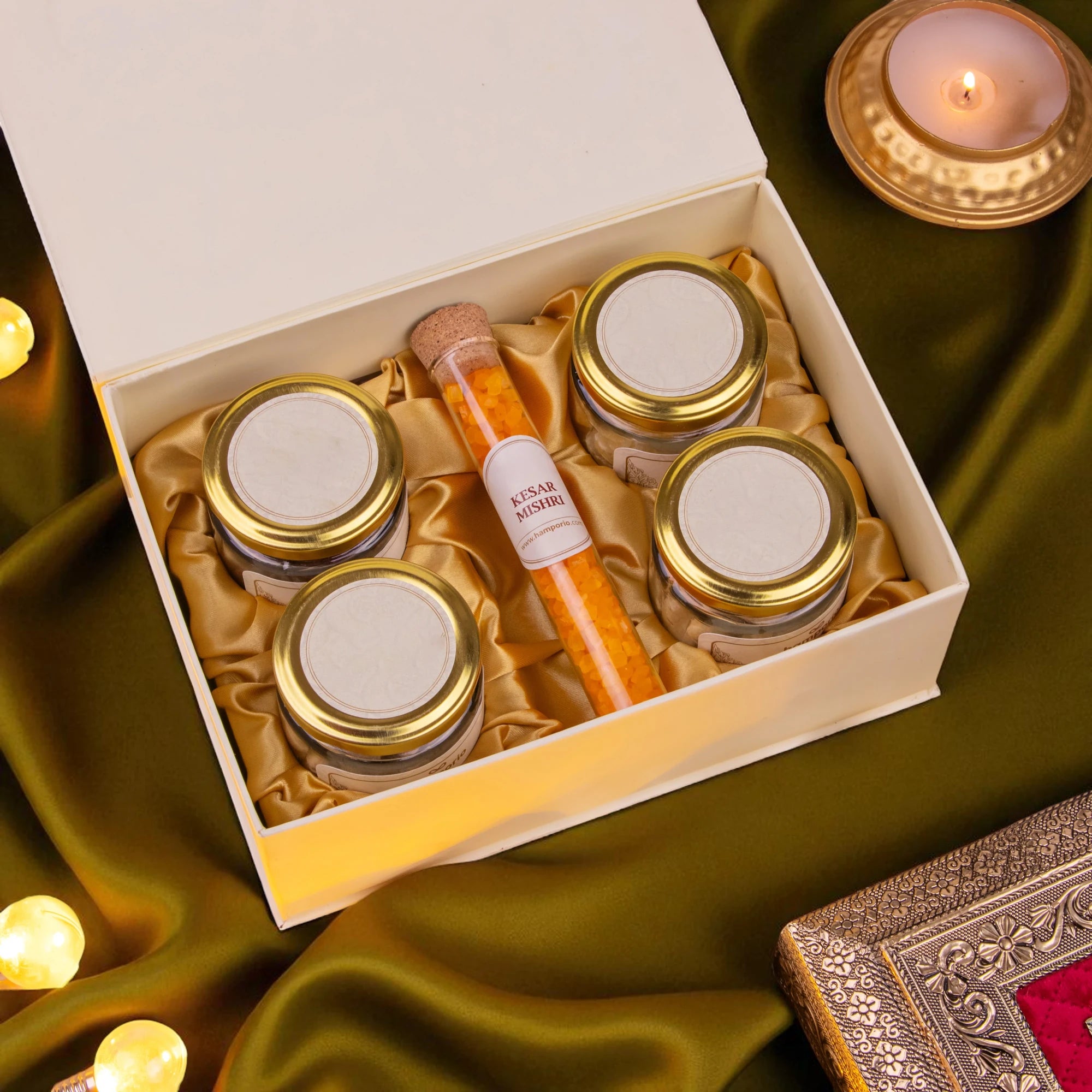 Ornate, opulent and elegant, our serene ‘white and gold gift hamper’ channels ethereal grace into a traditional masterpiece. Four gourmet jars come placed in a luxurious satin base, lending the gift a royal twist. Gift your employees and customers a surprise as you pamper them with a uniquely beautiful hamper.