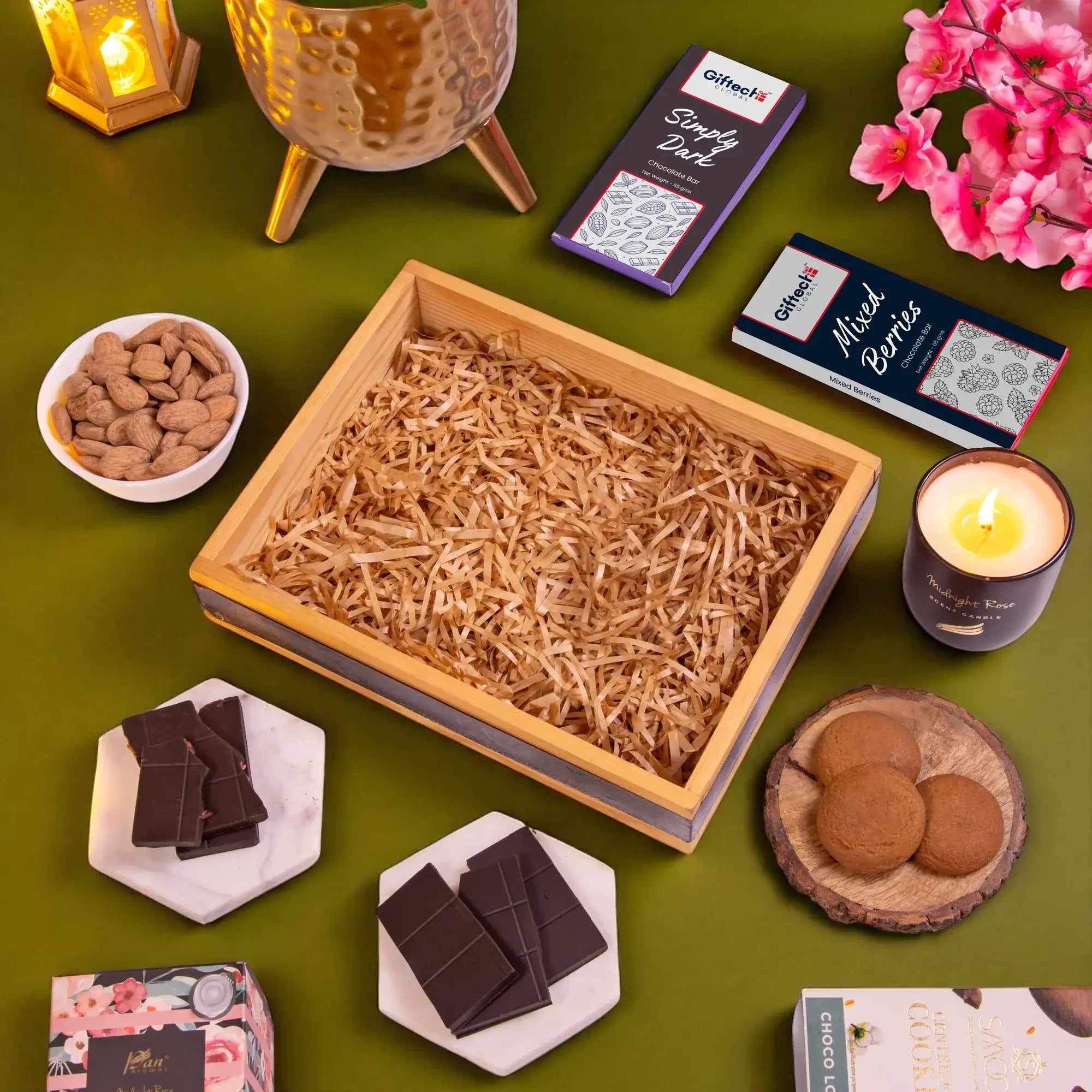 A fragrant and chocolatey Diwali gift for your business associates, this kit is a sureshot people winner! Make them feel appreciated and a part of your company with a wooden tray filled with choco cookies, choco berries, roasted almonds, a fragrant candle and a loving wishes card.