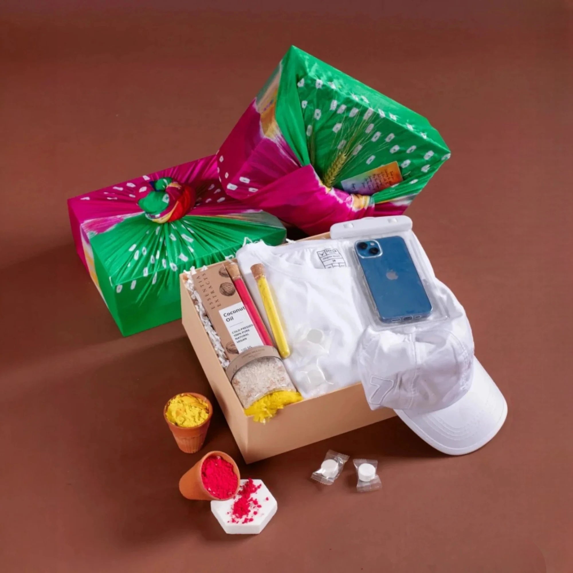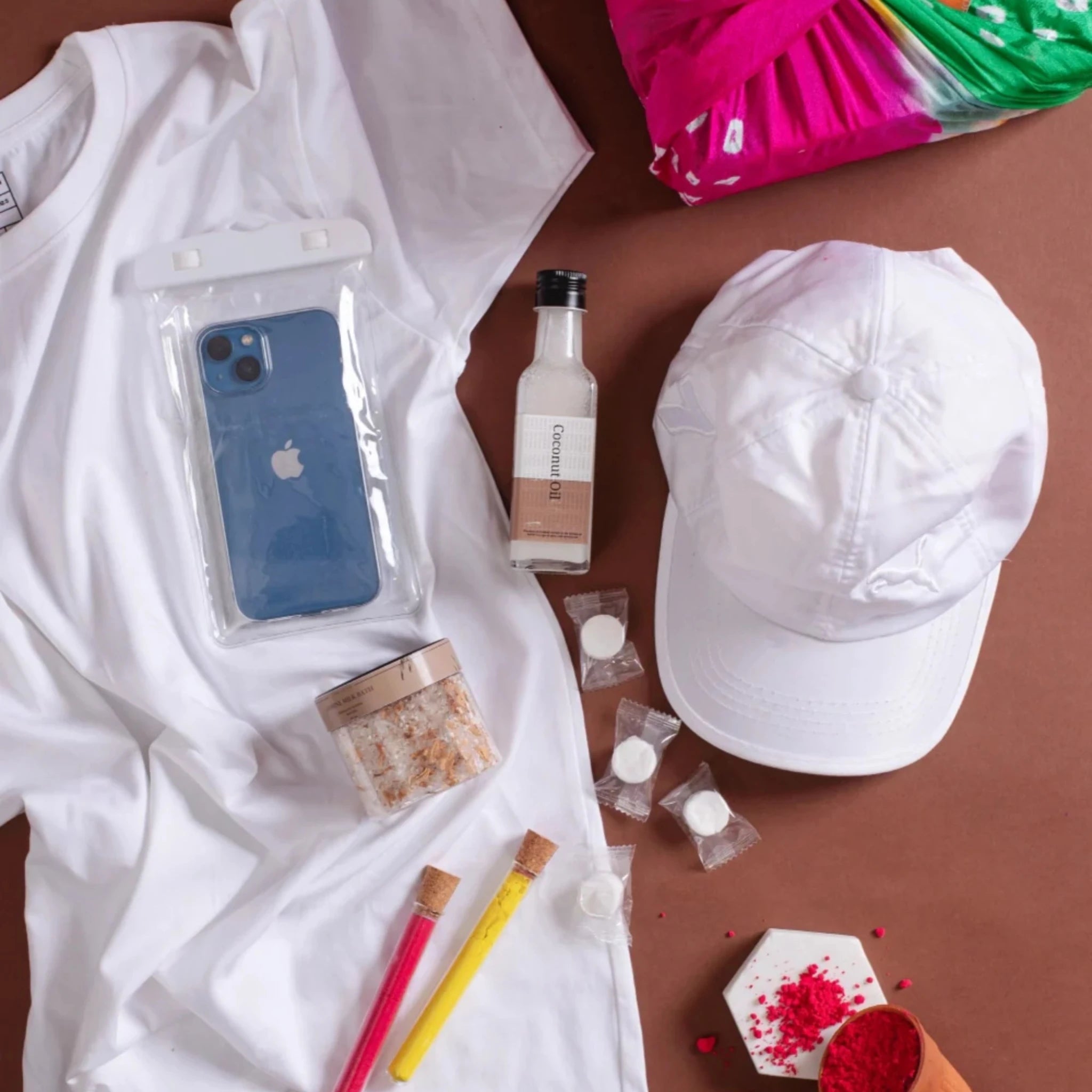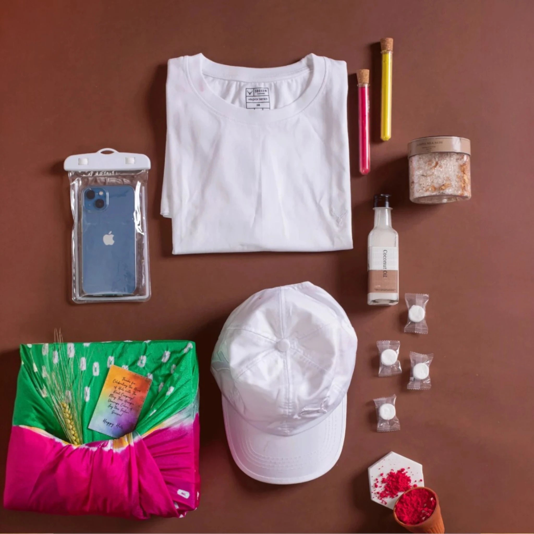 Stay fresh, protected, and festive-ready with this thoughtfully curated Holi care kit! Featuring a breathable cotton T-shirt and white cap, hydrating coconut oil, and Jasmine bath salt, this hamper ensures post-Holi pampering. The waterproof phone pouch keeps your device safe, while the organic gulaal test tubes and face sheet masks provide a complete Holi care experience.