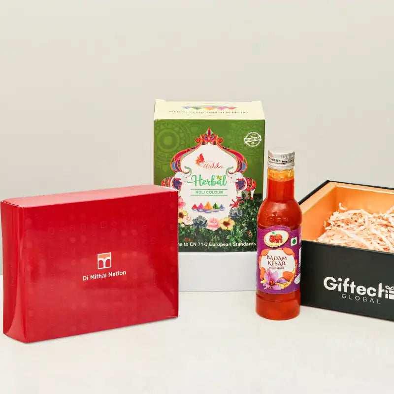 Immerse yourself in the festive spirit with this delightful Holi hamper! Featuring premium herbal colors, rich Kesar Badam Thandai, and the traditional sweetness of Gujiya, this hamper is a perfect blend of fun and flavors. A thoughtful Holi greeting card adds the final festive touch, making it an ideal gift for loved ones!