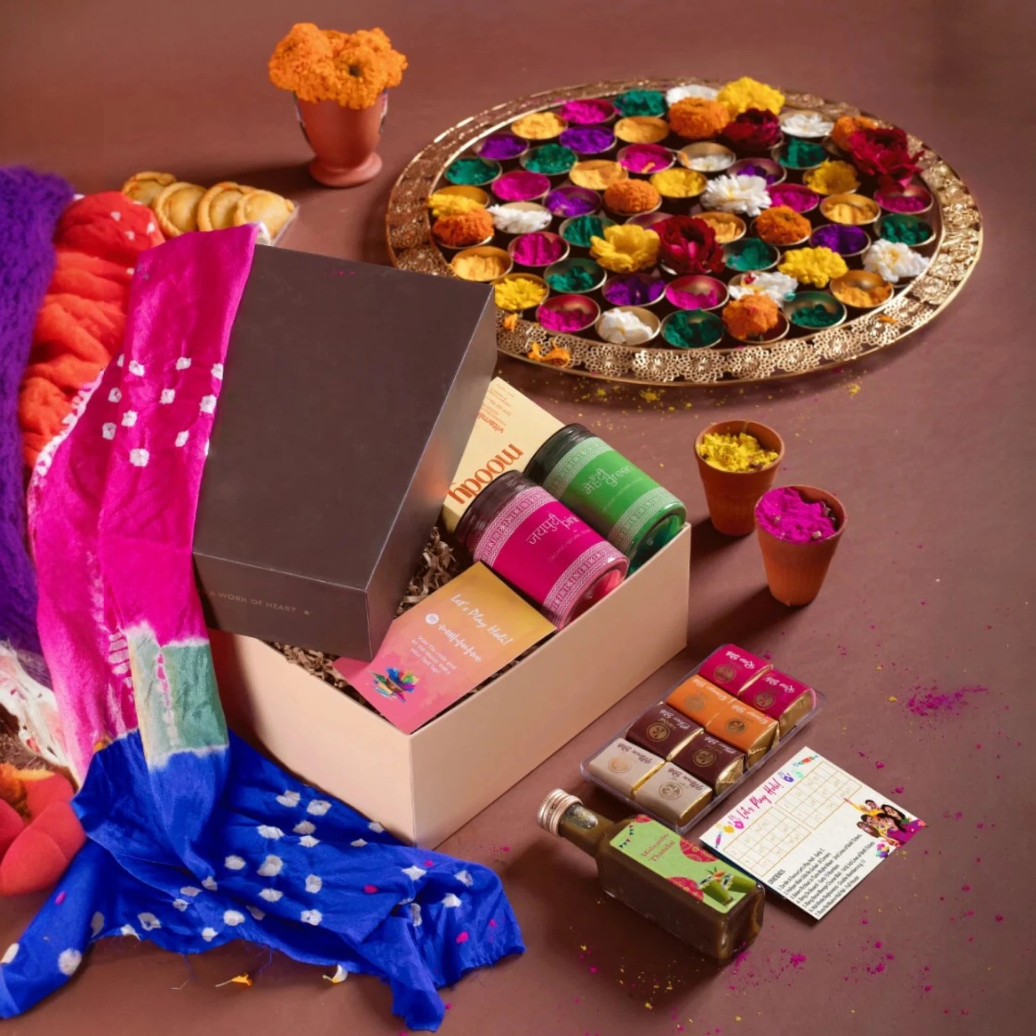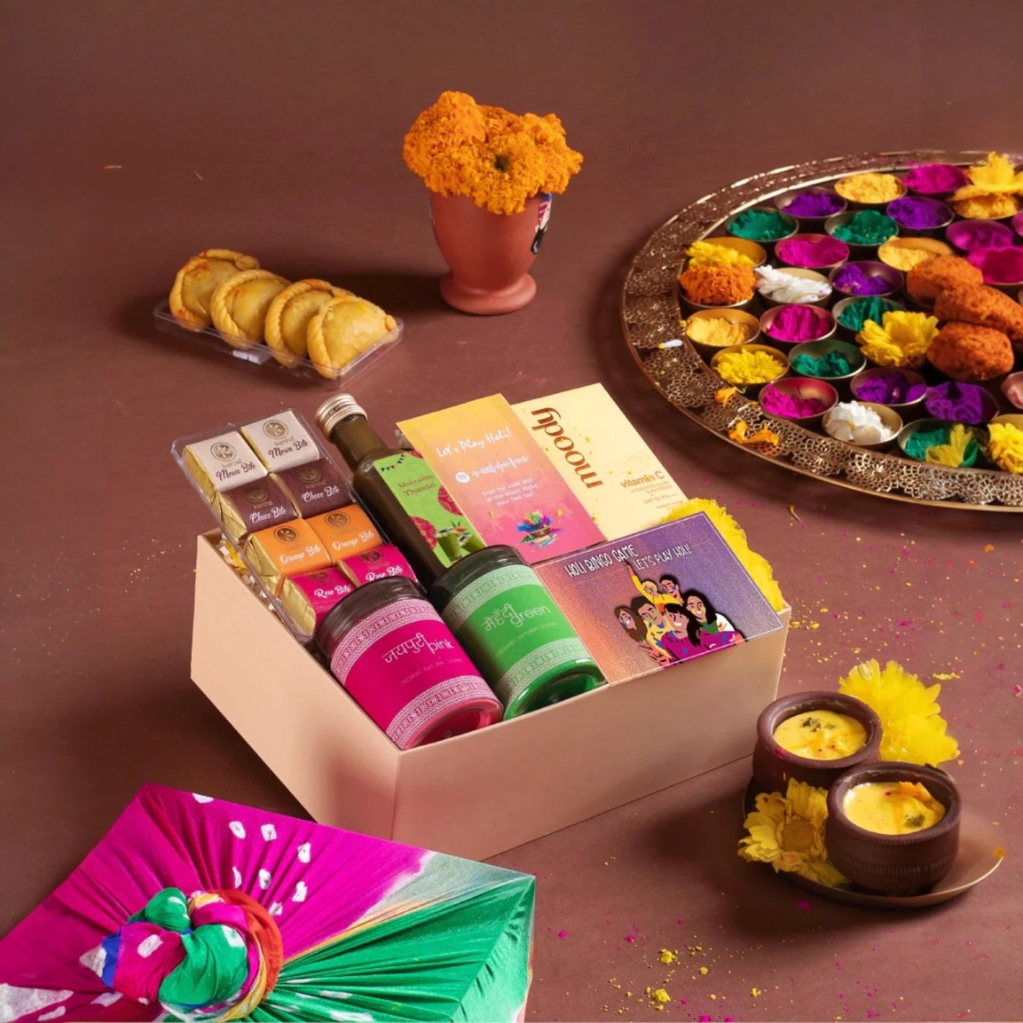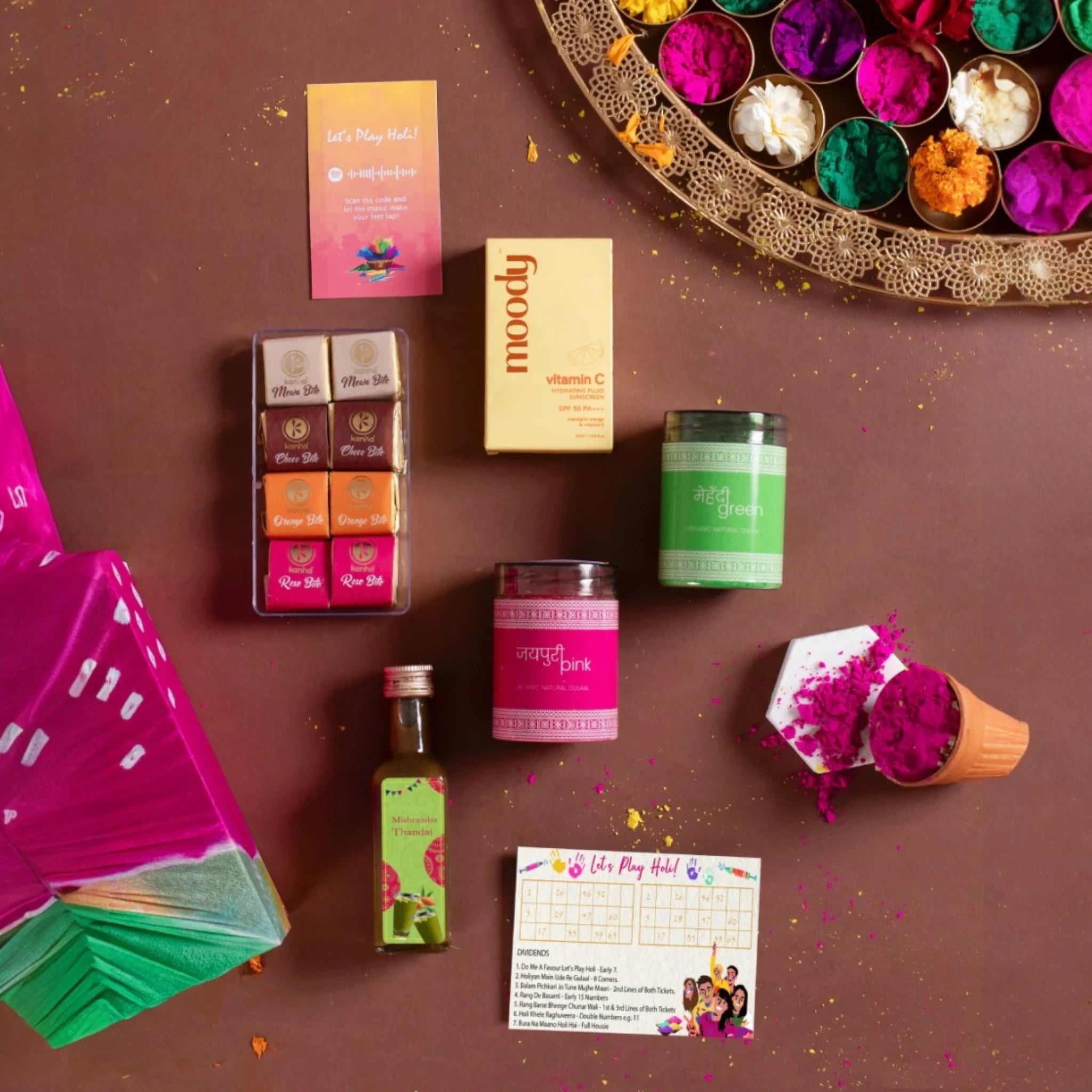 Make your Holi celebration even more fun and interactive with this exciting hamper! Enjoy vibrant organic gulaal, indulge in a variety of sweets, and stay protected with Vitamin C sunscreen. Sing along to your favorite Holi tunes with a special Holi playlist card, and engage in festive fun with a Holi Tambola game. A complete package for a joyful and playful Holi!