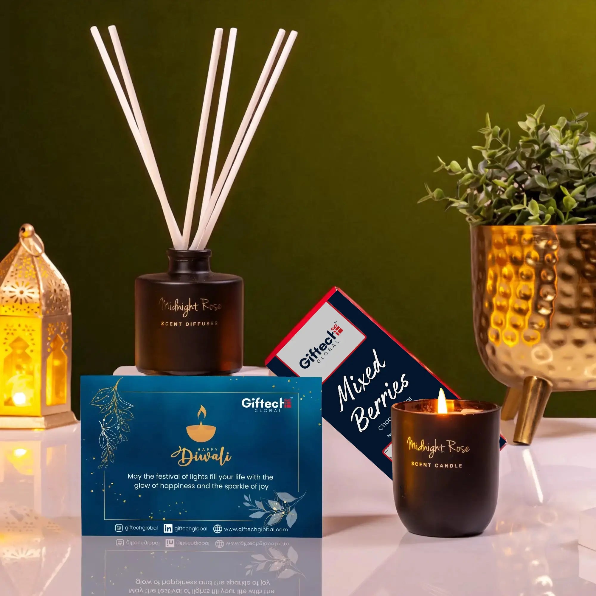 A gesture of appreciation and a gift of congratulations goes a long way in motivating an employee. This Diwali, do it with our signature golden-hued tray. It contains berry chocolates, a premium candle and oil diffuser and a festive greeting card.