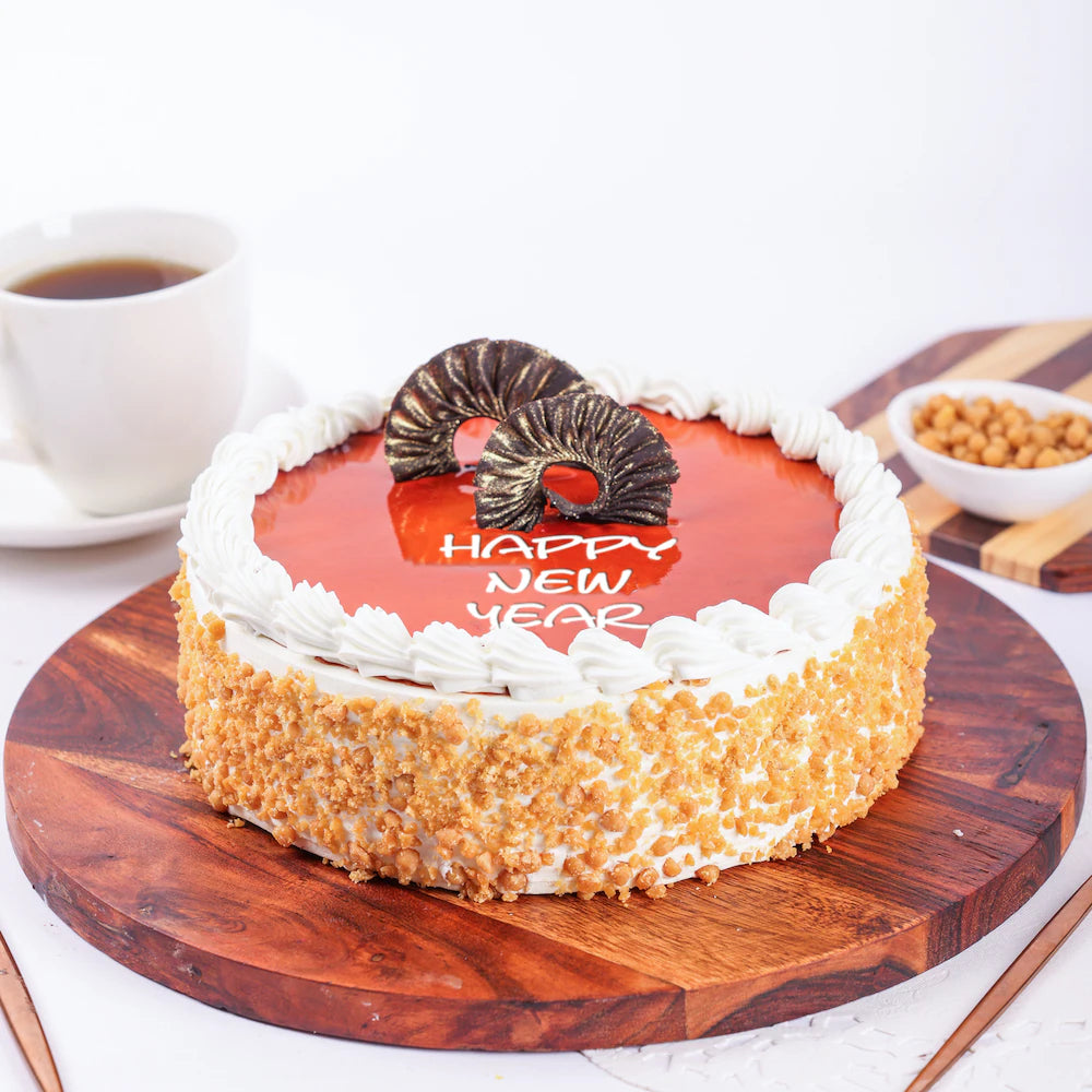 Celebrate the New Year with our Butterscotch Delight Cake, with a soft vanilla sponge layered with crunchy butterscotch and creamy vanilla, topped with cherries and chocolate. A festive treat that adds joy and sweetness to every celebration.