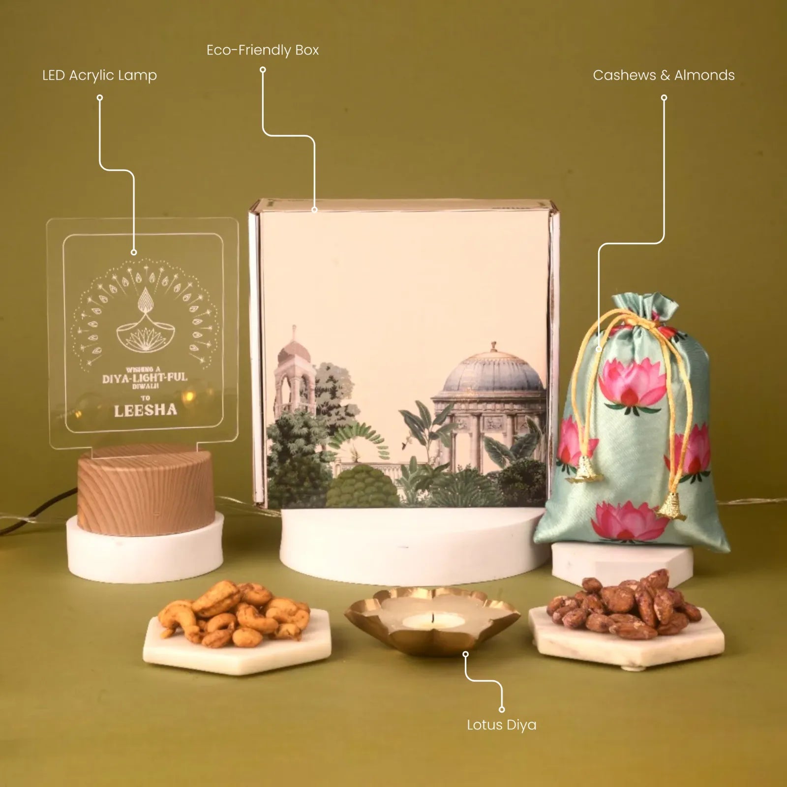 The Nutty Indulgence Hamper is a festive hamper crafted for those who appreciate the harmony of flavors and festive décor. With spiced nuts like peri peri cashews and rose petal almonds, it combines tradition with a hint of modern zest, making it a delightful choice for the season. The addition of an illuminating lotus diya adds a spiritual and decorative touch, symbolizing the light of Diwali and the joy of new beginnings. Thoughtfully presented, this hamper makes for one of the most versatile Diwali hampers, suitable for gifting across family, friends, and colleagues. It is designed not only to please the palate but also to brighten festive spaces, making it a meaningful gift for the season of lights.
