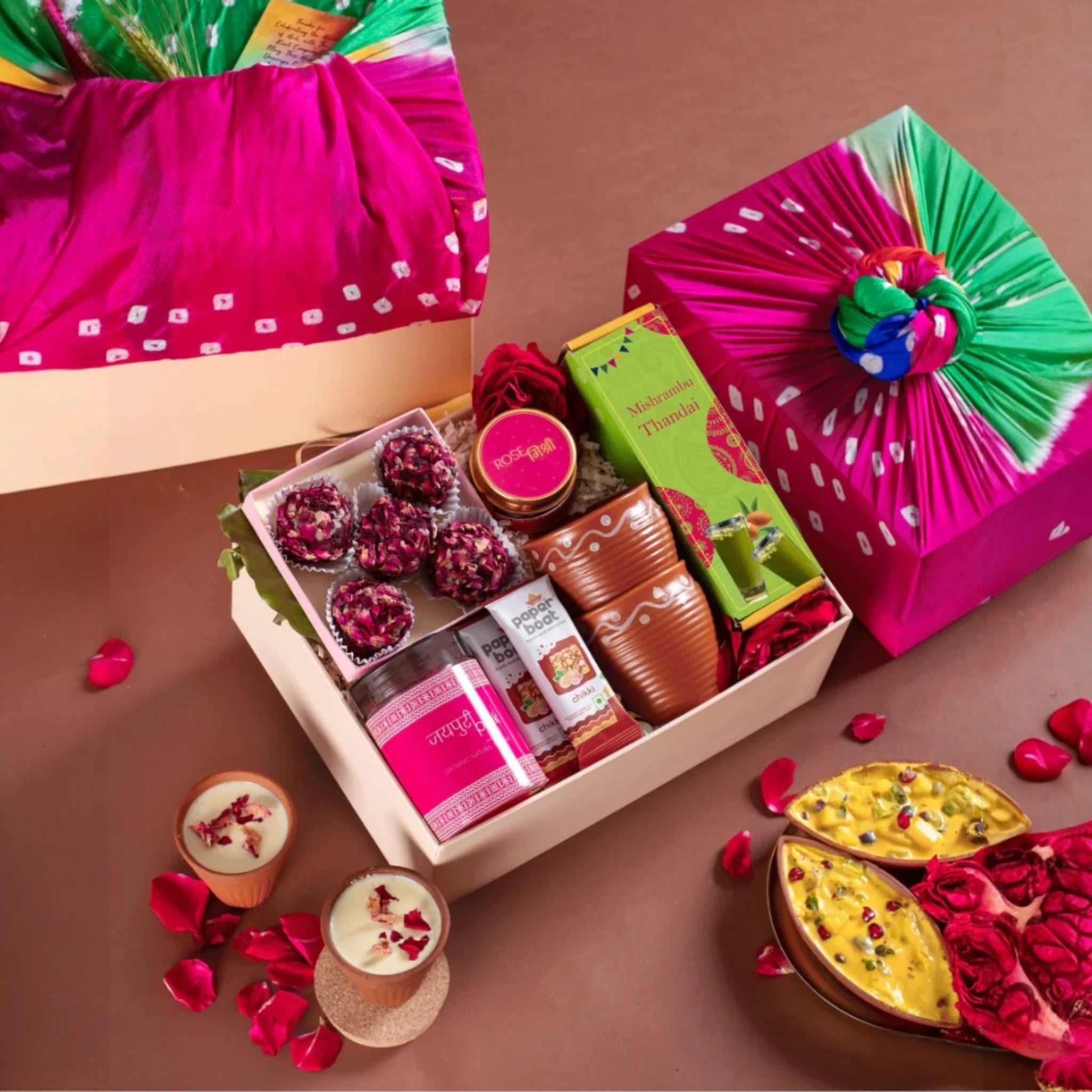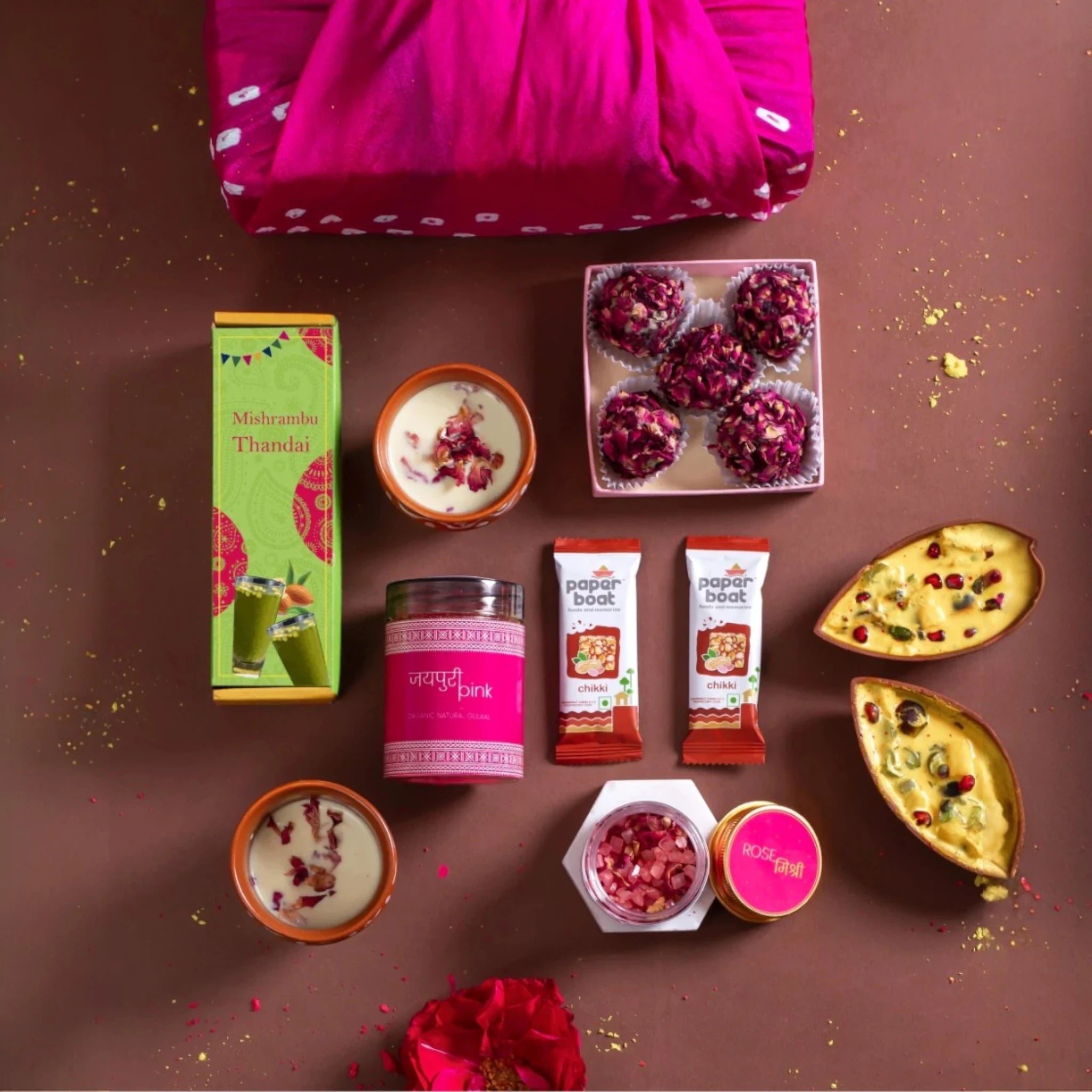 A delightful mix of sweets and traditions, this hamper is crafted for a flavorful and colorful Holi celebration! Relish the taste of Mishrambu Thandai, peanut chikkis, sweet rose mishri, and rose petal laddoos for an authentic festive treat. Paired with pink organic gulaal and two ceramic kulhads, this hamper is a perfect blend of tradition and indulgence.