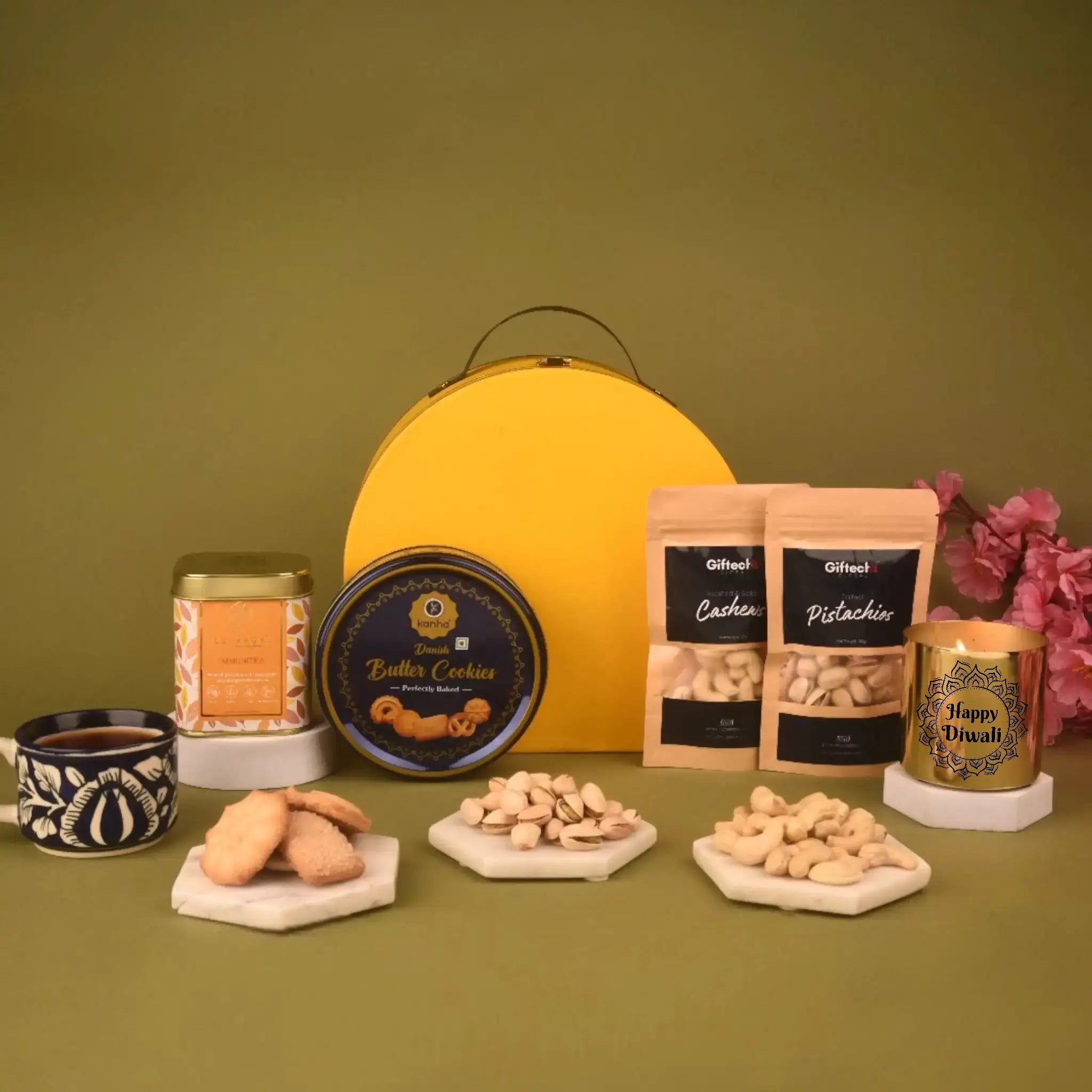 The Immunity Boost Box is a festive hamper that combines health, flavor, and warmth in perfect harmony. With handpicked elements like detox tea, premium cookies, pistachios, and cashews, it is designed for those who value both indulgence and wellness. Accompanied by a metallic candle, it creates a serene atmosphere while offering nourishment through its carefully chosen treats. Ideal as a Diwali hamper, it represents the spirit of thoughtful gifting where care and celebration go hand in hand. This balance makes it one of the most meaningful Diwali gifts, especially suited for families and professionals looking for something beyond the usual sweets.
