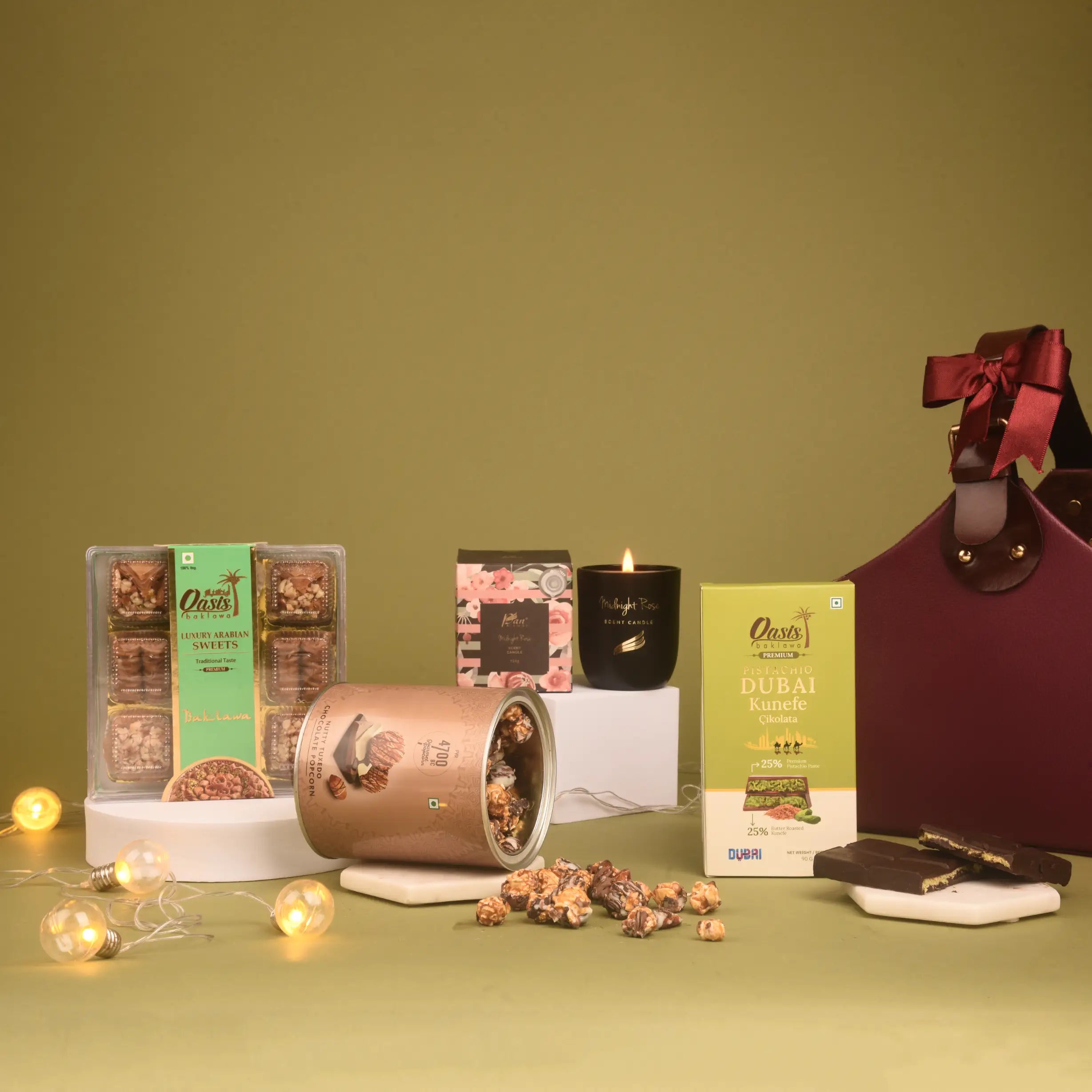 Experience grandeur with The Kunefe Royale Basket, a true celebration of gourmet indulgence. Combining the rich heritage of baklava with the contemporary delight of kunefe chocolate, it brings a taste of royal feasts to festive gifting. Enhanced with fragrant candles and gourmet popcorn, it goes beyond the traditional mithai and dryfruits hamper, offering an extraordinary journey of flavors and experiences. Presented in a luxe basket, this festive hamper is perfect for creating unforgettable impressions. As a Diwali gift, it speaks of refinement, indulgence, and elegance, making it an ideal choice for those who appreciate the finer things in life.