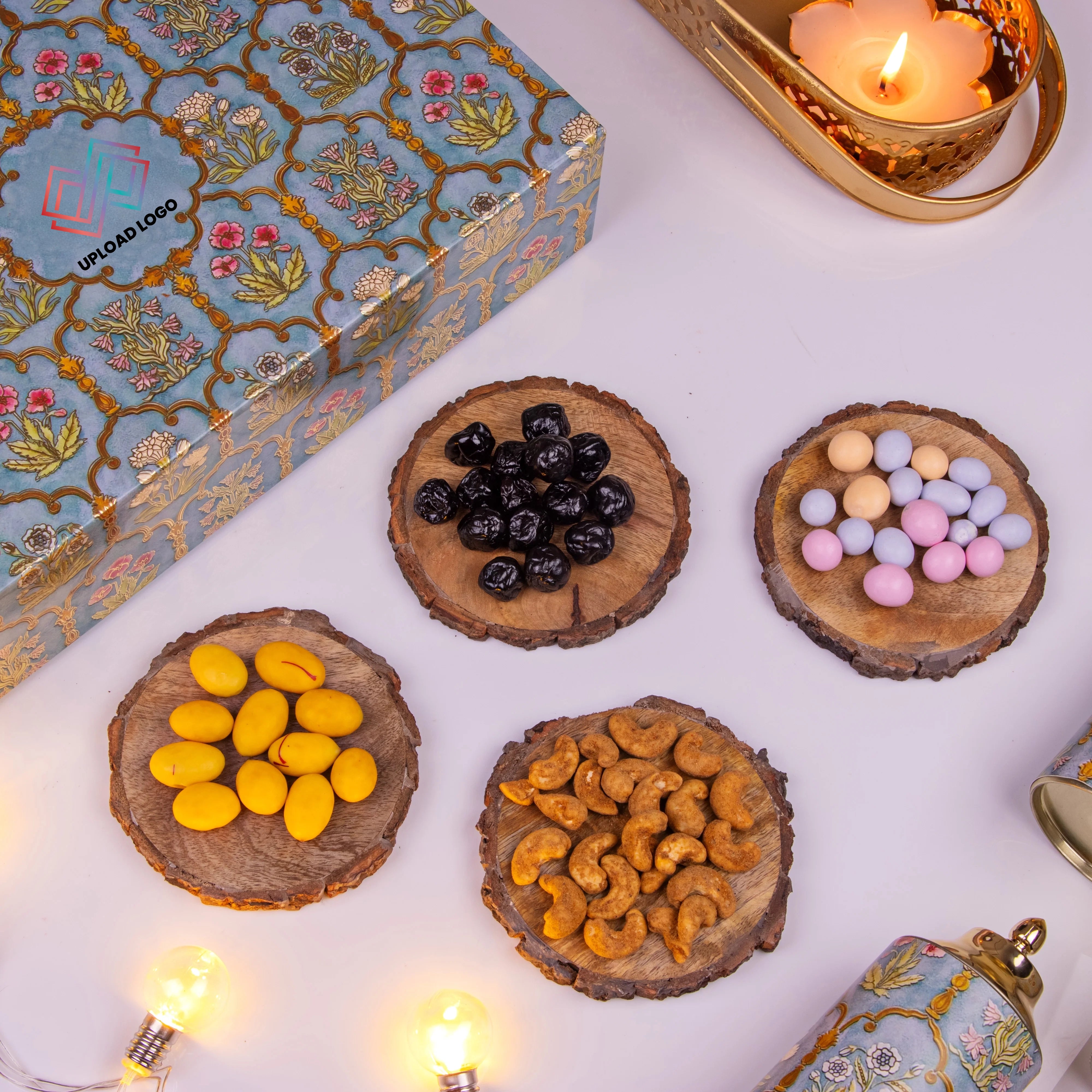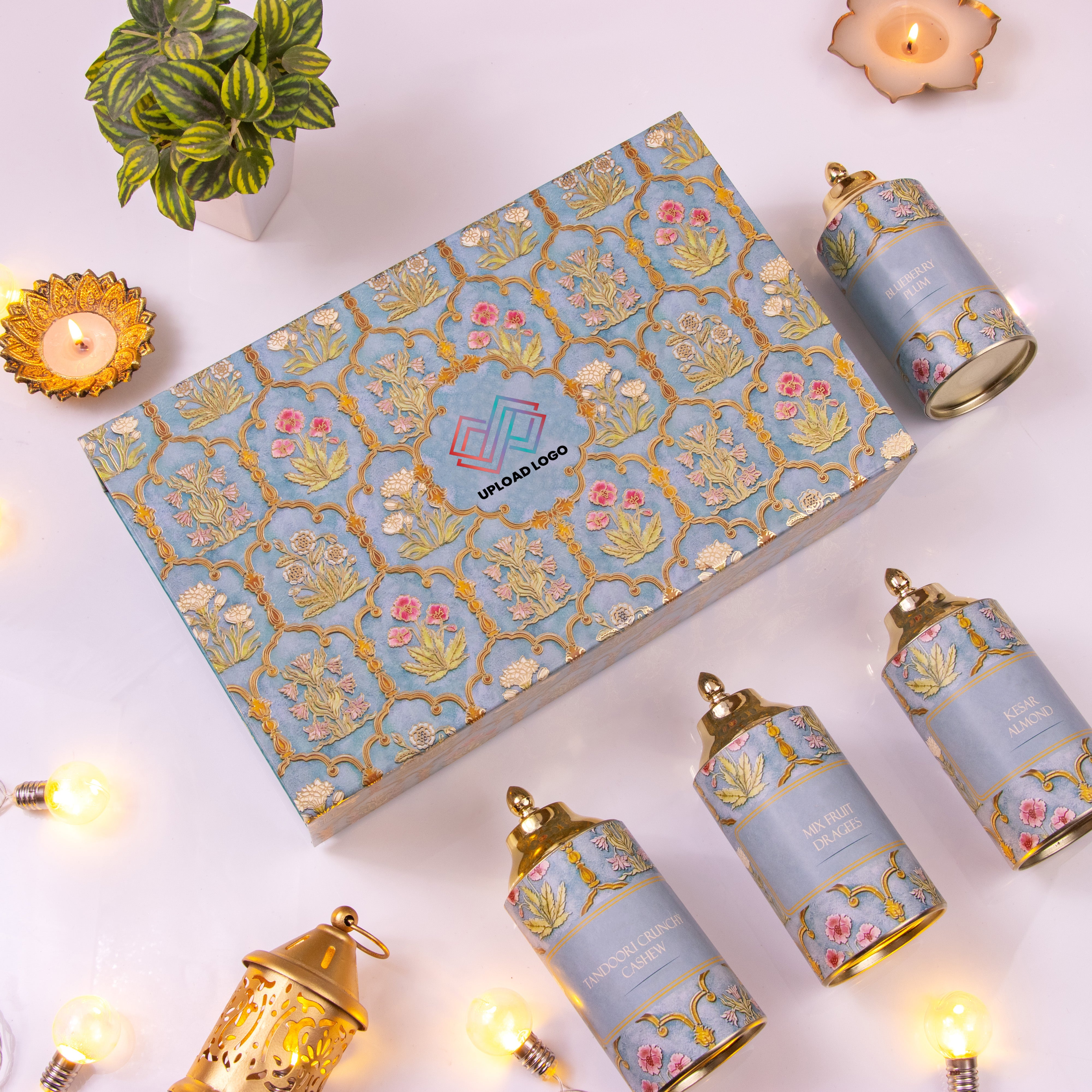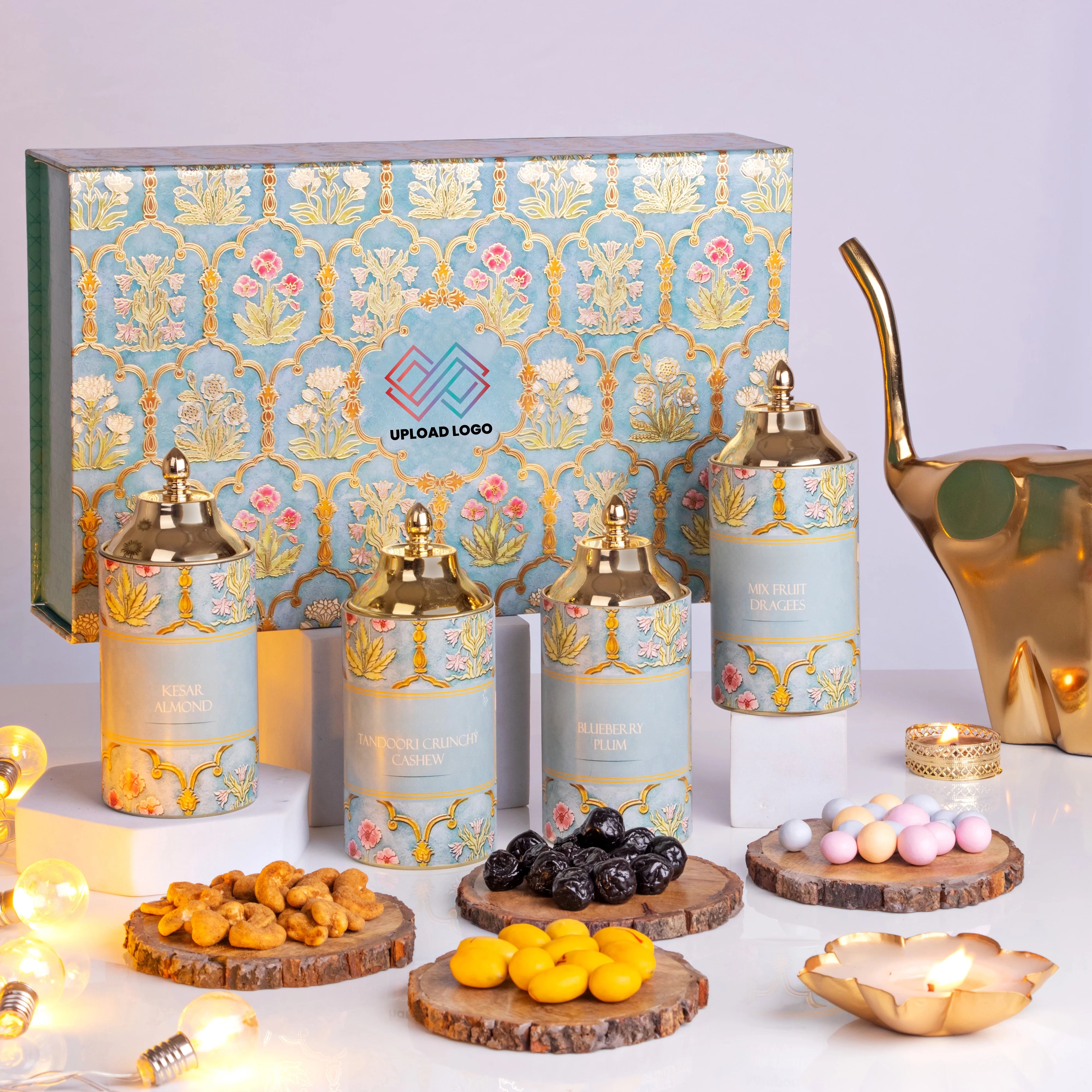 Featuring a golden traditional motif against a teal background, our hamper includes gourmet treats crafted for the connoisseurs of luxury. An exceptional gift for employees, customers or wedding.